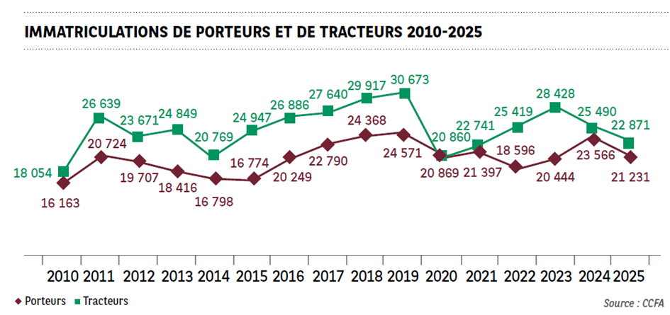 Les porteurs totalisent 21 249 immatriculations sur 2025, soit une chute d’environ -9,5 %. Les tracteurs suivent une trajectoire comparable, à 22 870 unités, soit un recul de -10,3 %.